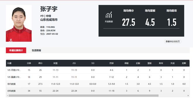 这两场比赛张子宇合计只打了34分钟(四舍五入),24中11,拿到55分9篮板3助攻2失误2盖帽,命中率高达91.66%,说张子宇是女版奥尼尔毫不为过啊。