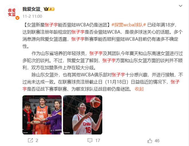 或许不是张子宇不想打成年组的比赛,根据我爱女篮的报道,已经年满18岁的张子宇是可以注册WCBA的,但张子宇本赛季能否登陆WCBA还说不准,因为张子宇的团队已经跟山东女篮进行了多次谈判但都没有谈拢,双方在加盟条件上存在较大分歧,也有其他球队在接触张子宇。(这或许就是张子宇没有代表山东女篮成年组参赛的关键)