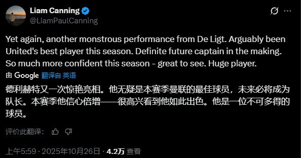 在观看了德里赫特在对阵布莱顿的比赛后,很难反驳坎宁的这一评价。他出场90分钟,贡献了1次拦截6次解围1次封堵,5次回收球权,2次空中对抗全部成功,传球准确率高达91%。而纵观整个赛季,德里赫特的表现同样非常优异。据Sofascore统计,这位曼联后卫在英超九次首发的比赛中,赢得了61%的对抗,这表明他已成为阿莫林三中卫体系中的防守核心。