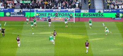 第36分钟,世界波!帕奎塔精彩远射扳平比分,西汉姆1-1纽卡