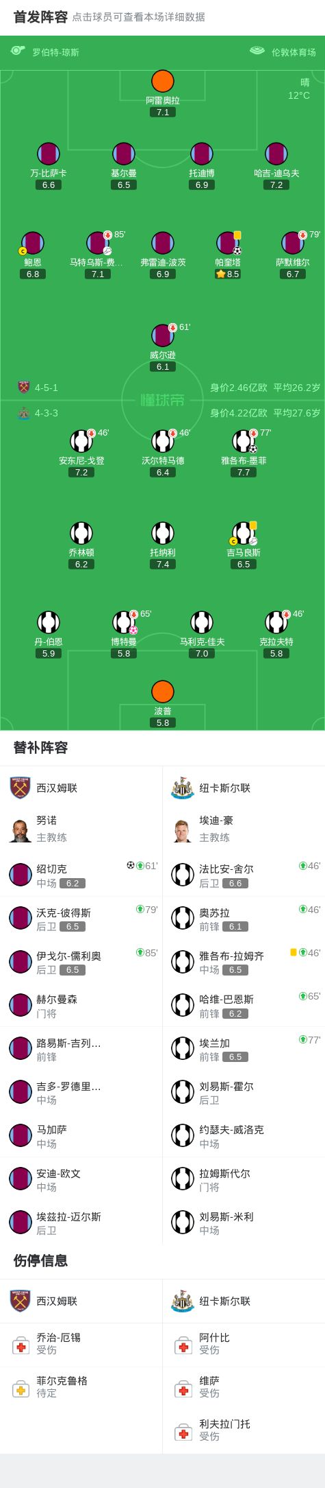 第45+5分钟,博特曼倒地解围自摆乌龙,西汉姆2-1纽卡