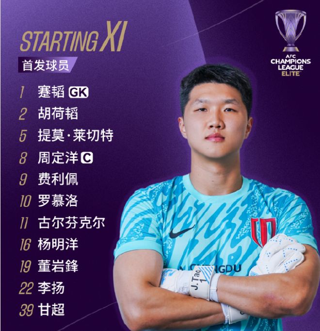 成都蓉城首发:1-蹇韬、2-胡荷韬、5-提莫-莱切特、11-古尔芬克尔、19-董岩鋒、22-李扬、8-周定洋、10-罗慕洛、16-杨明洋、39-甘超、9-费利佩